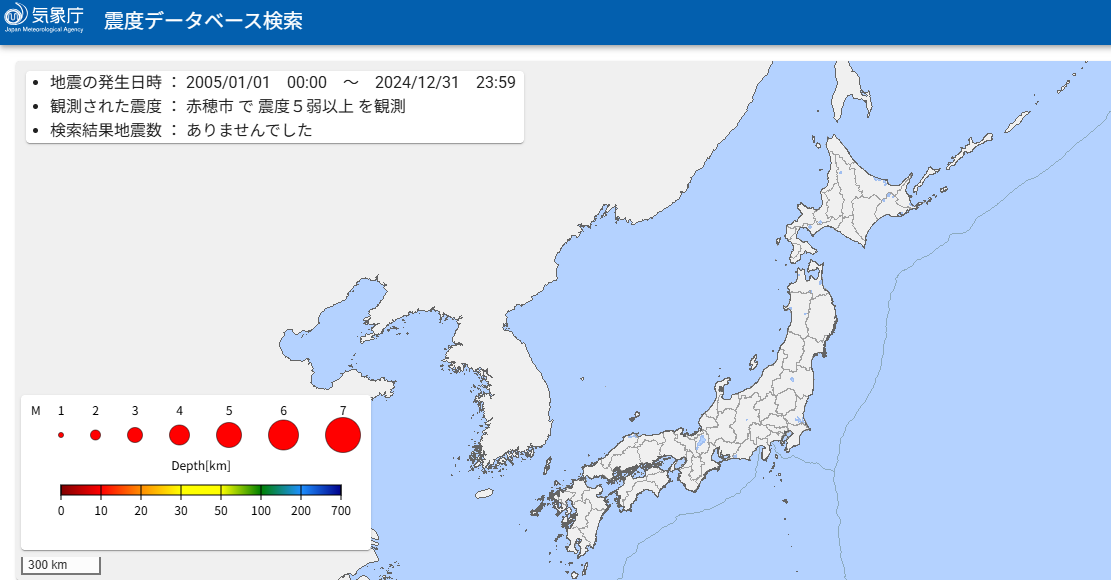 赤穂市における過去20年間(2005~2024)の地震の発生件数は、震度3以上が6回、震度4以上が1回、震度5弱以上は0回と、地震の発生件数が少ないことが分かります。(出典:気象庁|震度データベース検索)