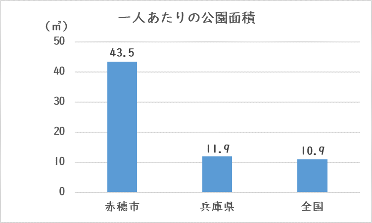 赤穂市の一人当たり公園面積は、兵庫県(神戸市除く)の一人当たり公園面積の約3.6倍、全国の一人当たり公園面積の約4倍となっており、一人あたりの公園面積がとても広いことが分かります。そのため、市内の公園では、子どもたちがのびのび遊びまわったり、高齢者の方々がゲートボールを楽しんだり、幅広い世代に利用されています。